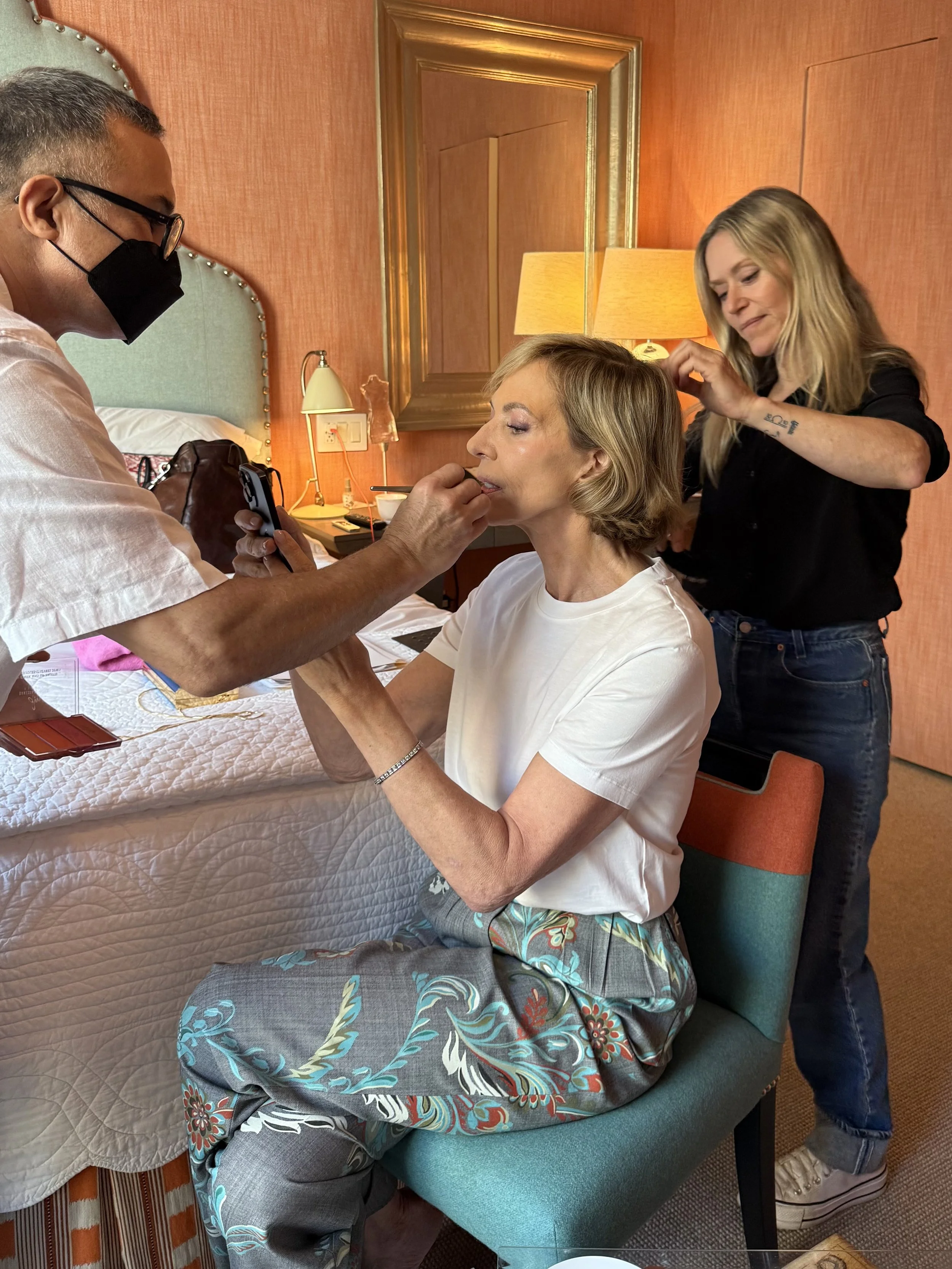 The tenderness in the room wasn’t performative: it was the kind of ease that only comes from long-term trust and care. A few photos were snapped for social media, but it didn’t feel curated…just lived-in. I watched as Jill helped Allison deal with a difficult earring clasp, as Matin gave her a final touch-up before heading out, and as Allison remembered her glasses at the very last minute, laughing that she almost walked out of the hotel without them. And before it was time for the car to arrive, Allison sat down on the edge of the bed one last time, pen in hand, carefully adding handwritten edits to her pre-typed notes. She spoke openly with me about how these kinds of events, even after decades in the public eye, can still make her a bit nervous. She is a consummate professional who always wants to get it right…and by being prepared, she always does.